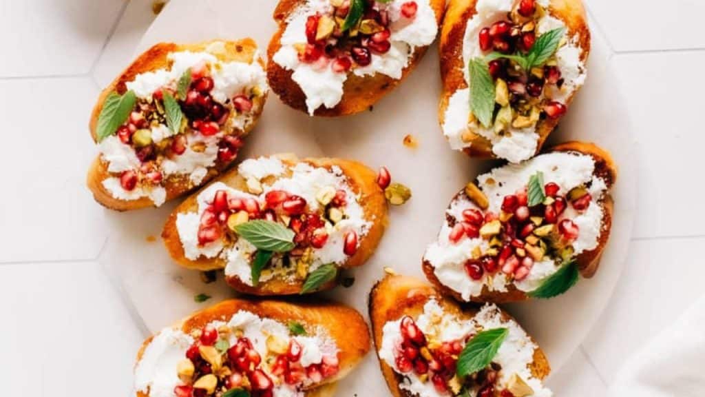 This beautiful goat cheese appetizer offers a scrumptious variety of textures and flavours: sea salted slices of lightly fried baguette spread with creamy goat cheese and topped with pomegranate arils and crunchy pistachios.