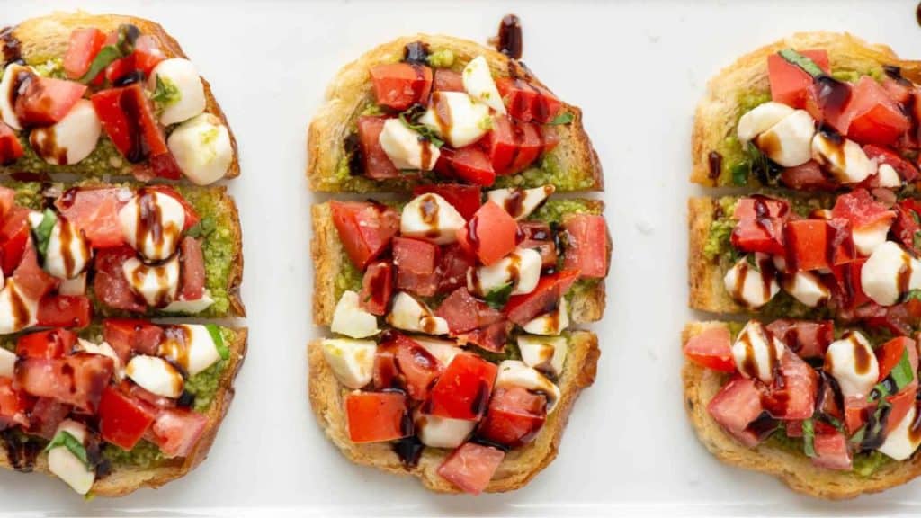 Caprese bruschetta is a fresh and flavorful appetizer that combines the classic flavors of a caprese salad with pesto and crisp, toasted bread. Juicy tomatoes, creamy mozzarella, basil and pesto are piled onto slices of toasted baguette or thick bread, then finished with a drizzle of olive oil and balsamic glaze. Each bite offers a perfect balance of textures and flavors, making it an easy, crowd pleasing starter.