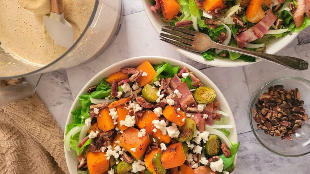 This Recipe for Butternut Squash Salad is warm and comforting and full of fall flavours. Paired with roasted brussels sprouts, feta cheese, white onion, toasted pecans, and crumbled bacon, it’s filling enough to be a satisfying meal all on it’s own!