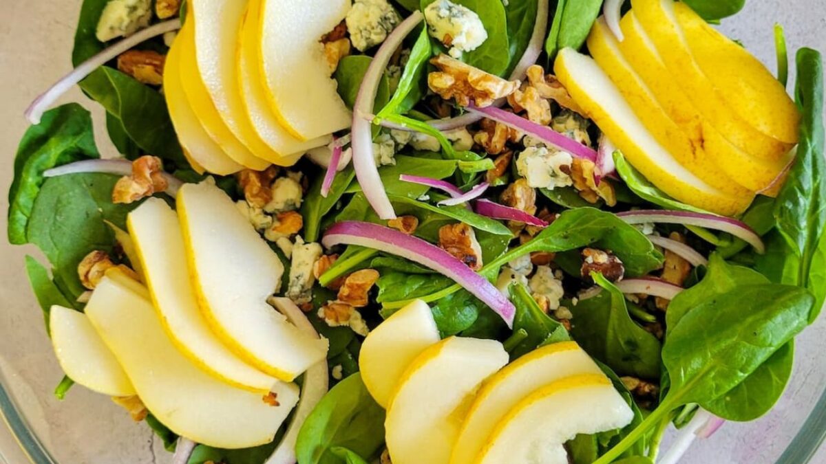 This refreshing Spinach Salad is loaded with juicy pears, toasted walnuts, crumbled blue cheese, and sliced red onions. It’s tossed in the perfect tangy honey dijon vinaigrette that takes it to a whole other level.