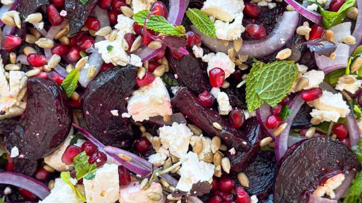 This roasted beet salad with feta, and toasted sunflower seeds is fresh, colorful, and full of Mediterranean flavor. Tossed in a simple balsamic vinaigrette, it’s a beautiful side dish for holidays like Thanksgiving or Christmas – or any time you’re craving something vibrant and wholesome.