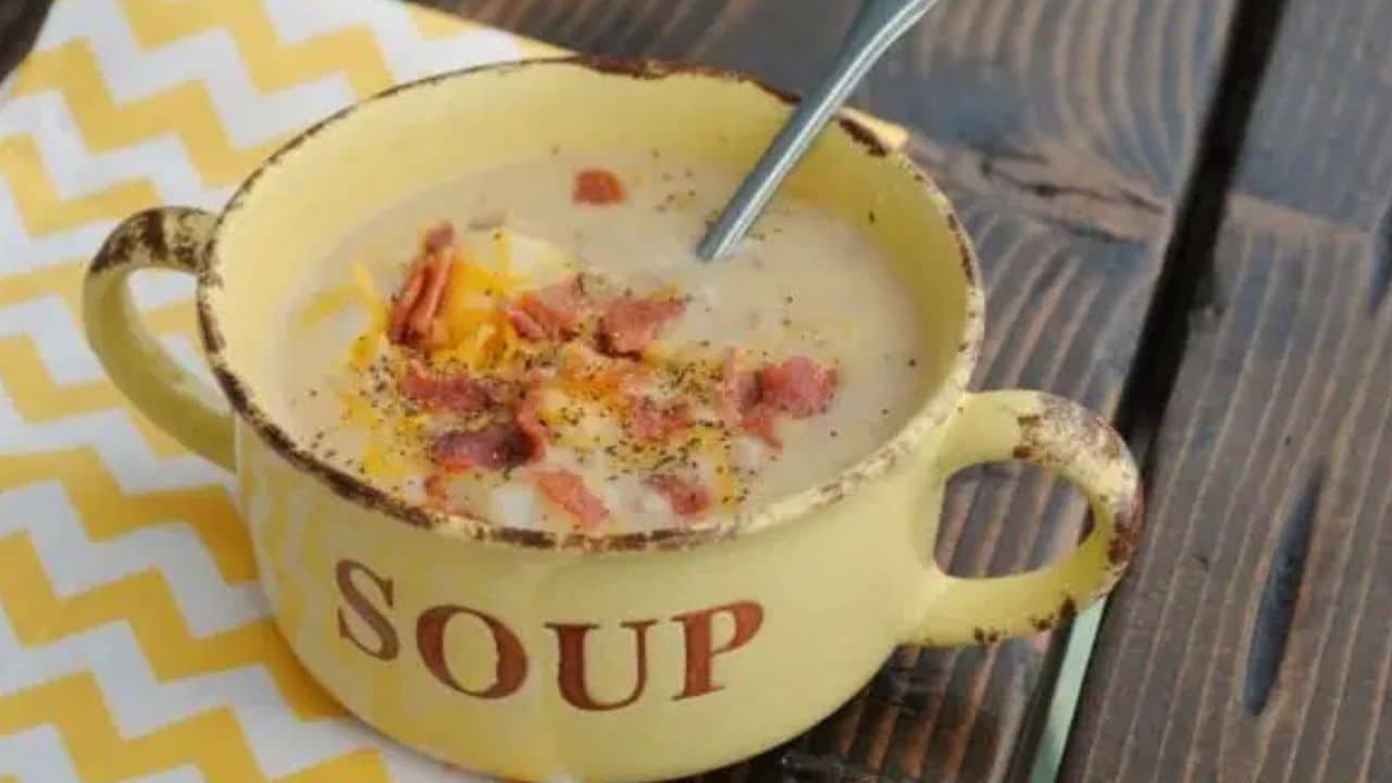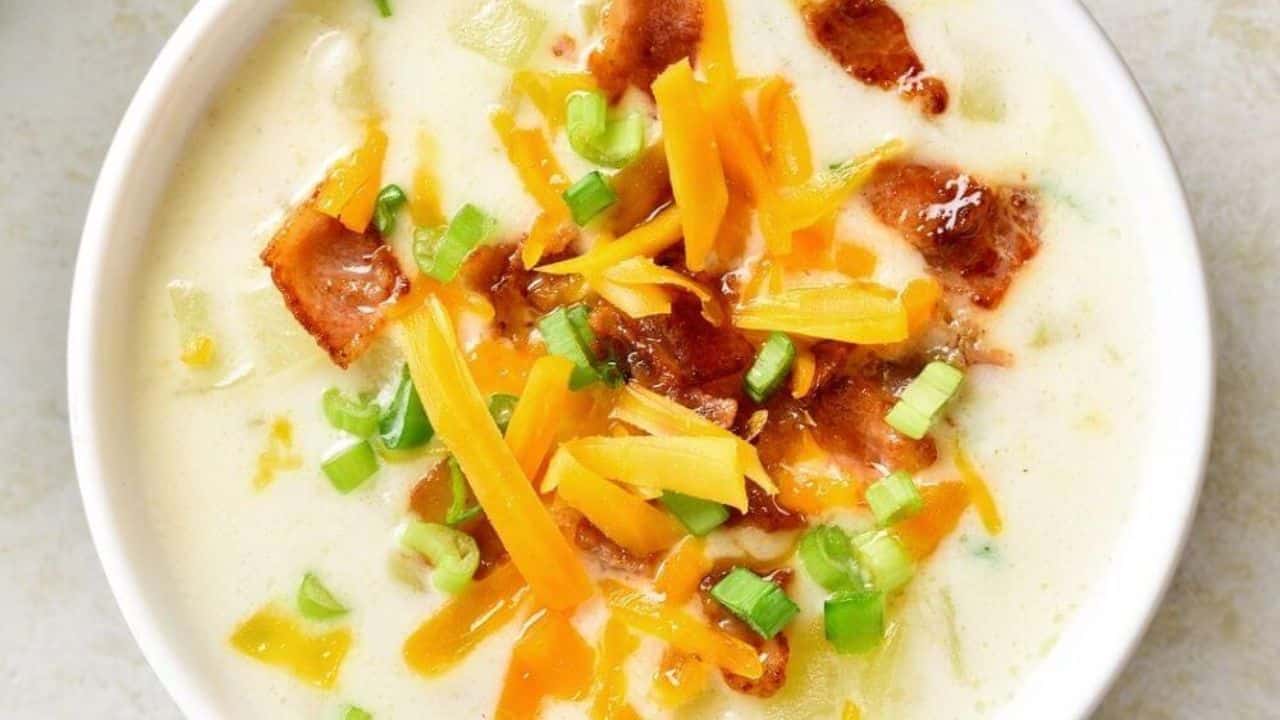 Creamy potato soup recipe – a rich, chunky and silky soup in a flavorful chicken broth base and livened by fatty bacon. Loaded with more bacon pieces, cheddar, sour cream and green onions! This is one of my favorite classic recipes for this root veggie.