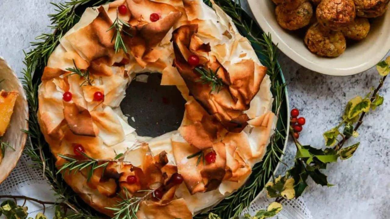 Chestnut, Mushroom & Squash Christmas Filo Wreath Pie