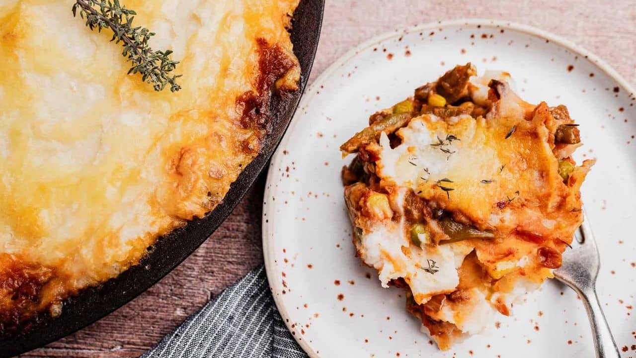 Vegetarian shepherd’s pie (sometimes called cottage pie) turns everyday ingredients into a hearty and delicious dinner option! The fluffy mashed potato topping gives way to a hearty filling of tender and savory vegetables. This recipe takes the best of traditional comfort food and gives it a tasty, meatless twist!