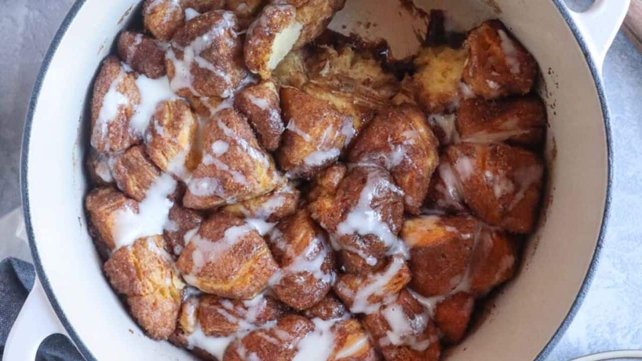 Dutch Oven Monkey Bread is warm, gooey, and baked to perfection in a cinnamon, brown sugar butter sauce. A sweet cream cheese glaze is drizzled over the top of the warm biscuit pieces. Enjoy for breakfast with a cup of coffee or as an evening dessert.