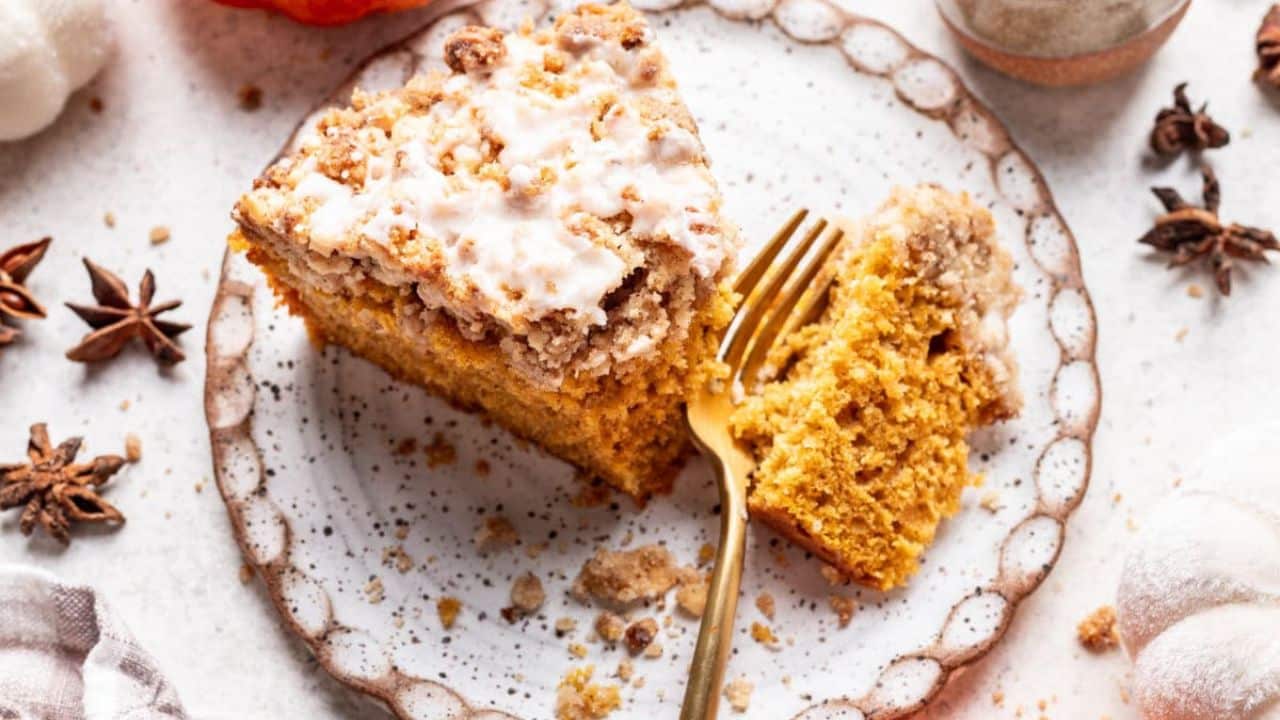 Pumpkin coffee cake is a moist pumpkin spice coffee cake topped with a buttery crumb topping and drizzled with a sweet vanilla glaze. It’s the perfect fall bake for breakfast, brunch, or dessert.