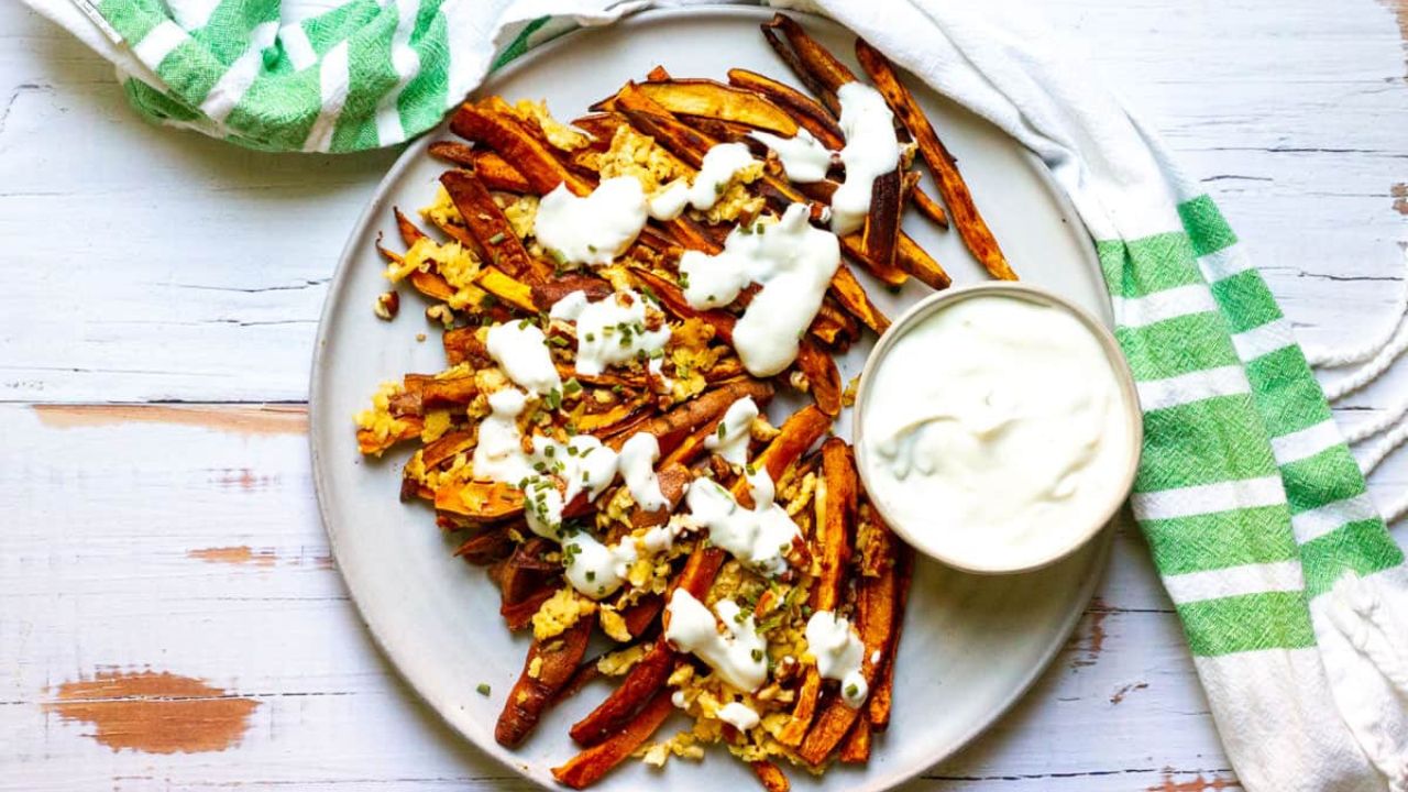 These easy loaded sweet potato fries are baked until crispy and topped with smoked Gouda, chopped pecans, and a creamy garlic yogurt sauce.