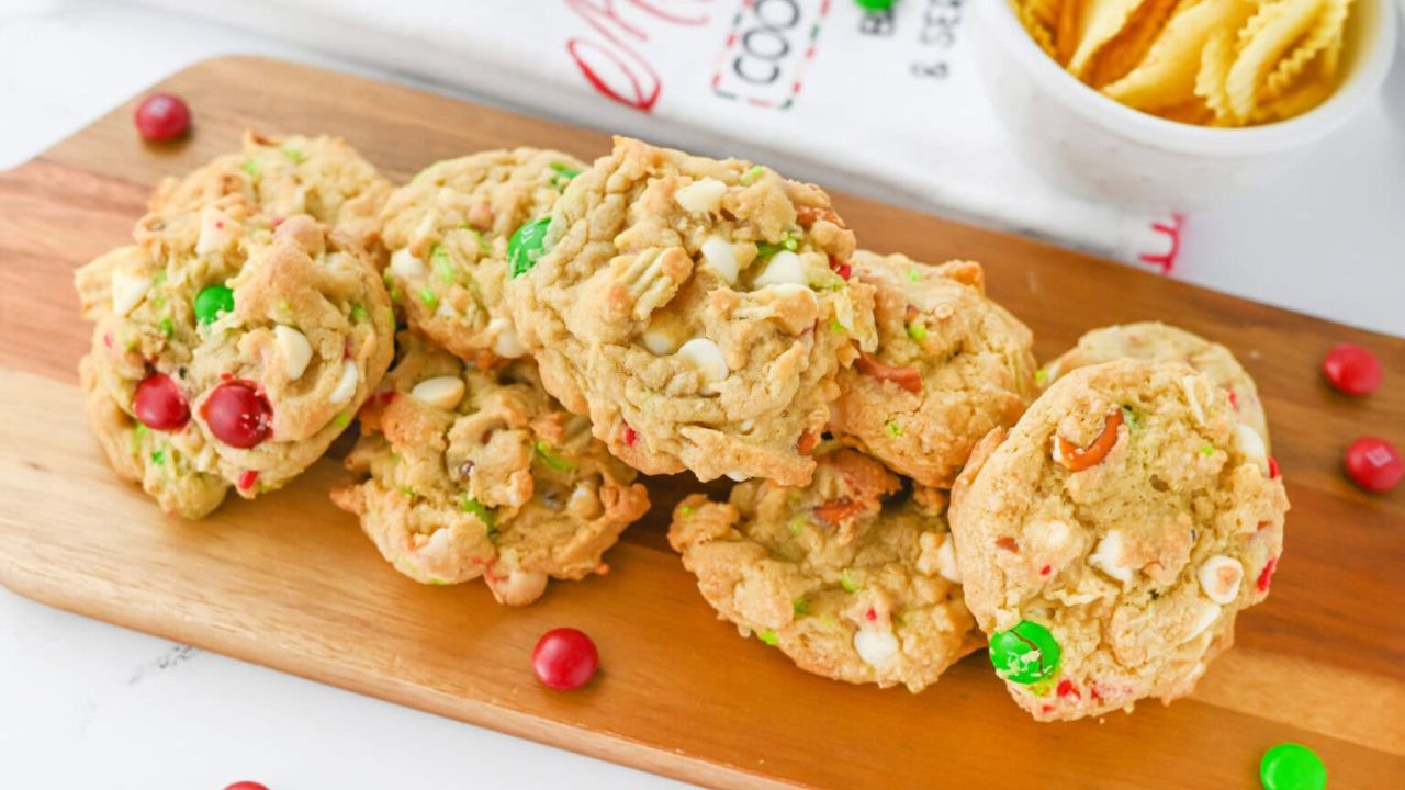 Looking for the perfect Holiday cookie recipe? Try these festive Christmas Kitchen Sink Cookies, loaded with all your favorite mix-ins like chocolate chips, M & M’s, pretzels, and even crushed potato chips. A soft, chewy, salty, and sweet cookie perfect for any Christmas cookie plate!
