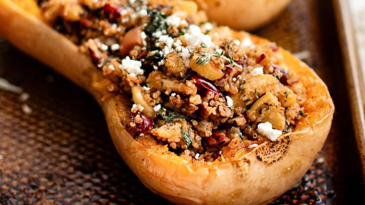 This Stuffed Butternut Squash recipe is made by stuffing roast butternut squash with a hearty combination of quinoa, kale, dried cranberries, herbs, and tender, sweet apples! It’s a flavorful vegetarian dish that’s versatile, too! Easily add Italian sausage or ground beef to instantly transform your stuffed squash into a meat-filled main dish.